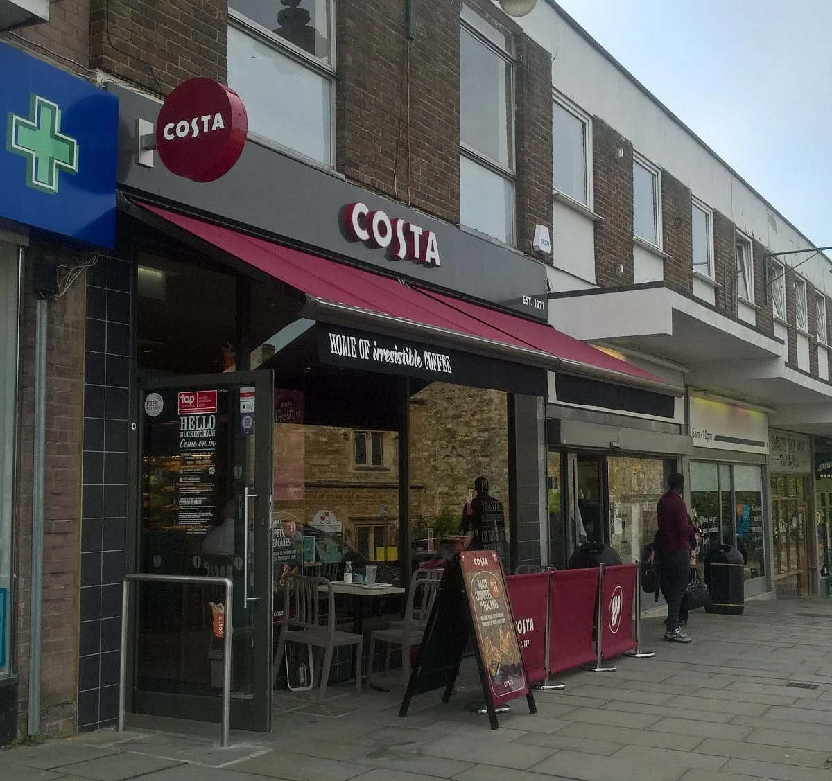 COSTAPick up your favourites at your local Costa GO TO WEBSITE Business TypeCaféPhone Number 01280 816733Address10 Market Hill, Buckingham MK18 1JX Opening TimesMonday-Friday 7am-6pm Saturday 7:30am-6pmSunday 8am-5pm